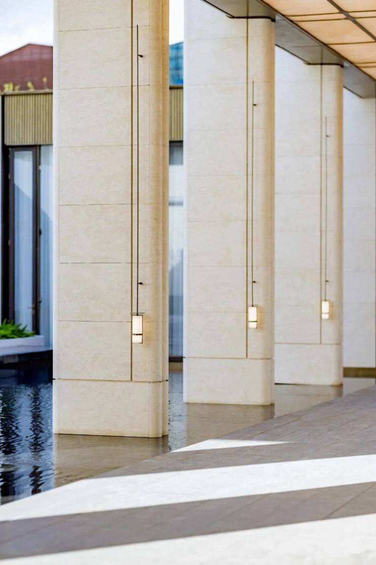 弧形石材工艺因其造价高、耗料多而闻名,而 招商序从门庭、游廊、转换厅、风雨连廊到下沉式庭院,一以贯之的弧形石材,形成了统一的设计语言,营造视觉上的柔和高级感, 招商序将这种传统豪宅的设计手法应用到了700万级的产品之上,真的是降维打击。