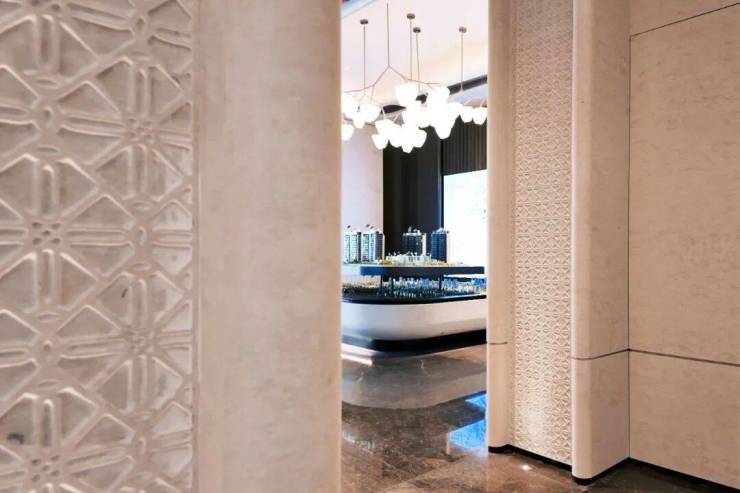 项目首层通过 硬朗直线呼应柔和曲线勾勒,辅以温润石材与古铜色金属线条融合,打造东西方美学共融的艺术藏品