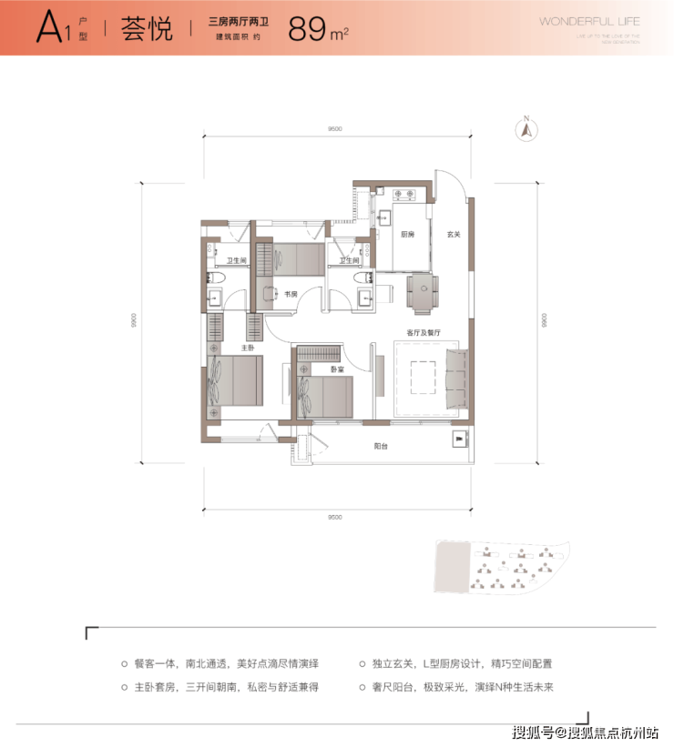 项目主力户型建面约89m²3房2厅2卫,近10米南向面宽,约6.3米的超大阳台打造更舒适的空间尺度感