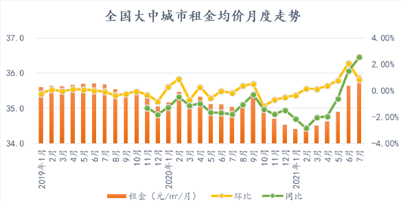 报告显示,7月全国大中城市租金挂牌均价为35.93元/平方米/月,环比上涨0.84%,较上月收窄1.26个百分点,同比上涨2.55%,租金同比涨幅再度扩大。