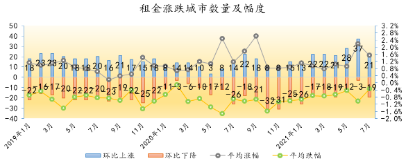从涨跌城市数量来看,7月全国大中租赁城市中,租金均价上涨城市21个,数量较上月减少16个,平均涨幅为1.54%,涨幅收窄0.64个百分点;下跌城市数19个,较上月增加16个,平均跌幅0.35%,跌幅扩大0.67个百分点。上涨城市数量较上月减少,但占据主要份额,旺季效应逐渐淡化,导致租金涨幅收窄。