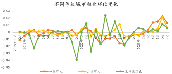 按城市等级看,7月各等级城市租金均价环比全线上涨。其中,一线城市平均租金为71.31元/平方米/月,环比上涨1.30%,同比上涨0.88%;二线城市平均租金为32.29元/平方米/月,环比上涨0.63%,同比上涨2.77%;三四线城市平均租金为24.21元/平方米/月,环比上涨0.59%,同比上涨1.78%。
