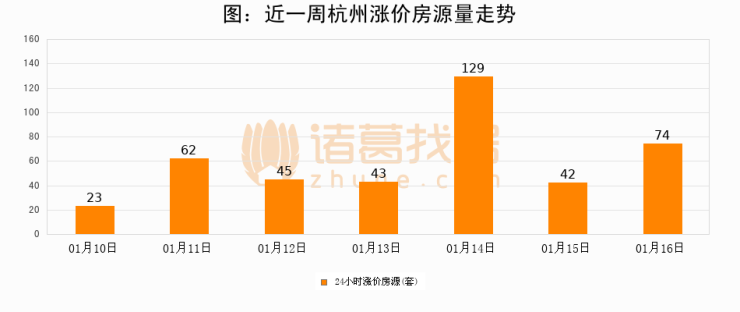 根据诸葛找房数据显示,杭州24小时涨价房源量为74套,较01月15日增加32套,环比上涨76.2%。与此同时,涨价房源占比小幅扩大,业主信心有所提升。