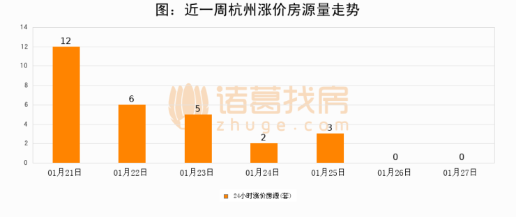 根据诸葛找房数据显示,杭州24小时涨价房源量为0套,较01月26日持平。