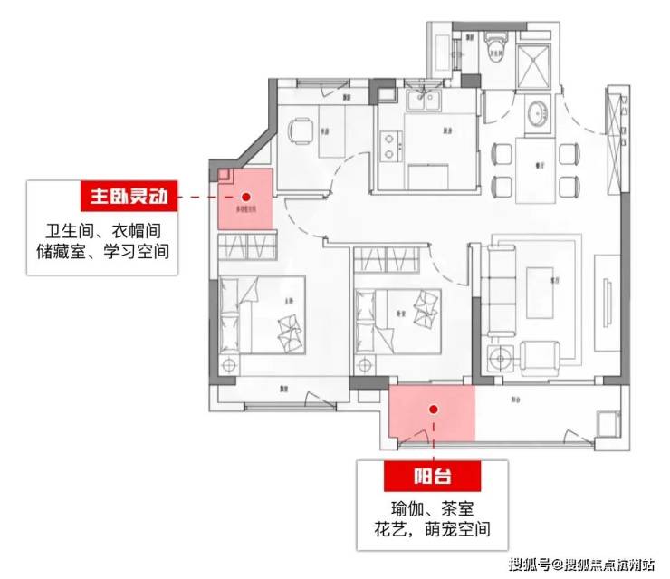 同时双开间的阳台面宽达到约 5.5米 ,赋予家庭更多生活情景,可以开辟一个角落安排茶室、瑜伽、萌宠空间。