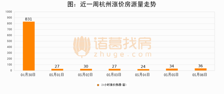 根据诸葛找房数据显示,杭州24小时涨价房源量为36套,较05月05日增加2套,环比上涨5.9%。与此同时,涨价房源占比小幅扩大,业主信心有所提升。