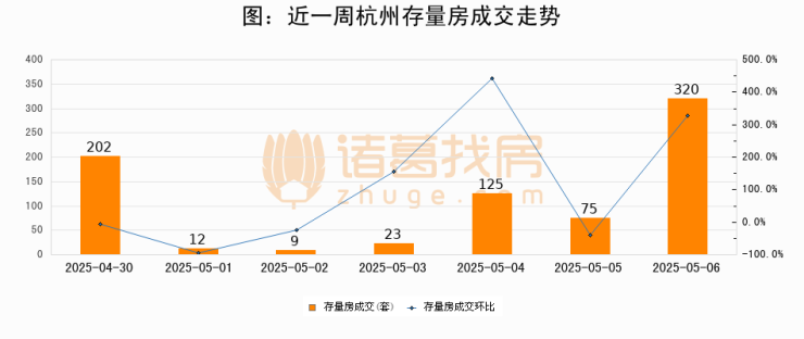 从存量房来看,2025年05月06日杭州存量房单日成交320套,比昨日增加245套,环比上涨326.7%。从近一周存量房成交来看,杭州存量房日均成交套数为109套,05月06日单日成交320套,高于近一周平均水平193.6%。