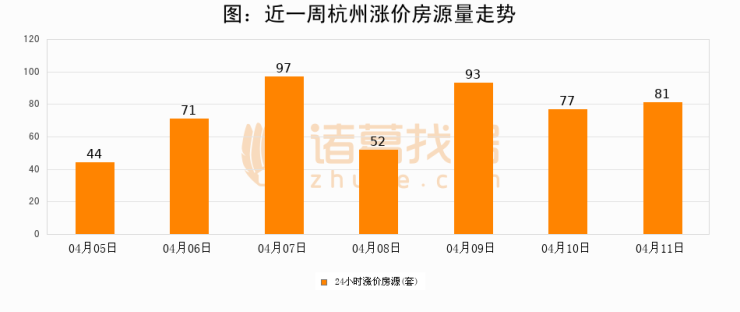 根据诸葛找房数据显示,杭州24小时涨价房源量为81套,较04月10日增加4套,环比上涨5.2%。与此同时,涨价房源占比小幅扩大,业主信心有所提升。