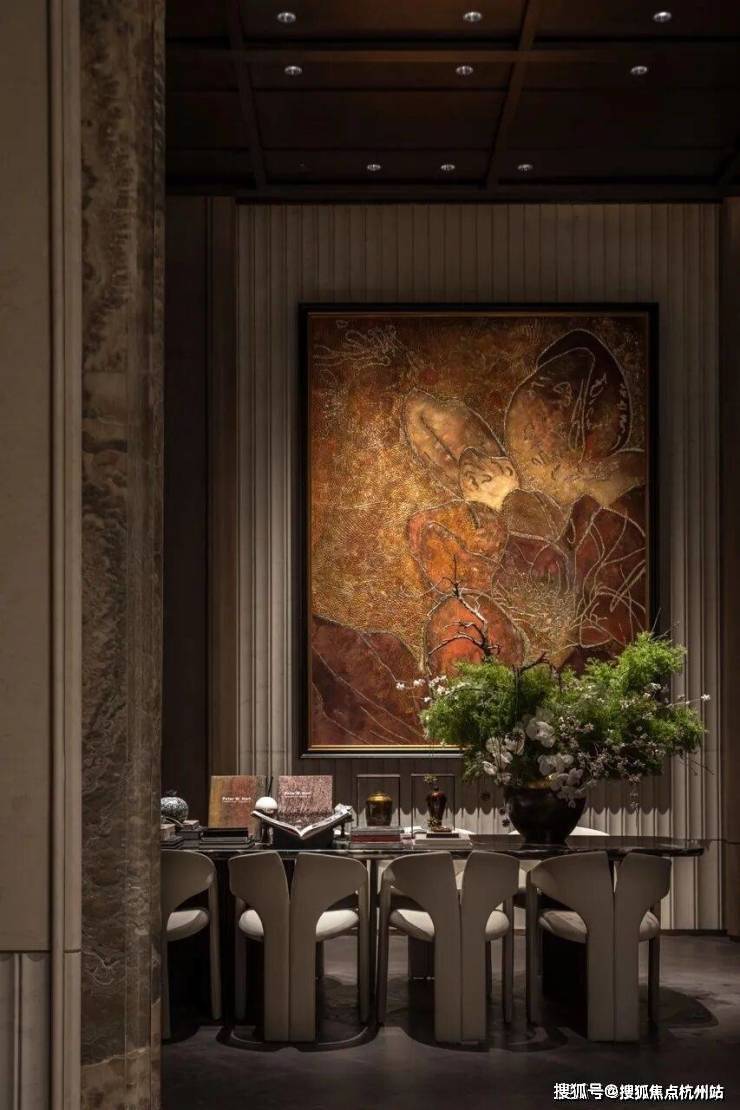 王府规制的通高大门,镶嵌昂贵天然水墨玉,自然天成的“山水画”,传递“玉出东方,门纳乾坤”的美好寓意;会客区域非遗艺术家画作《繁花映春》,耗时3月而成,诠释历久弥新的艺术价值。