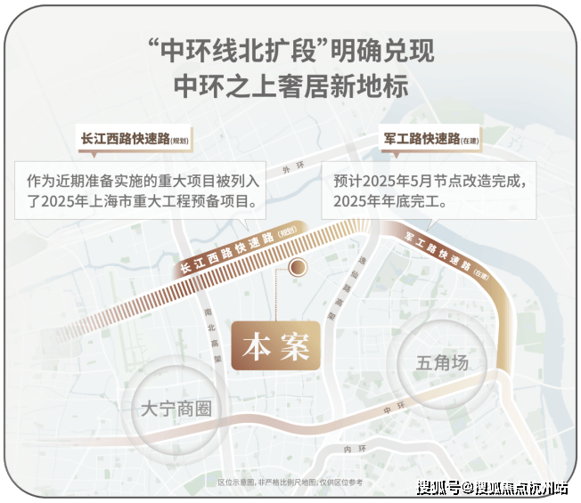 作为上海市重大工程,「中环北抬」通过军工路、长江西路、沪太路三条快速路互联,重构浦西北交通骨架。这项工程不仅延伸中环线,更通过立体路网打造串联宝山、杨浦、静安的「城市交通脊梁」,竣工后将形成复合功能交通带,推动沿线板块价值升级。