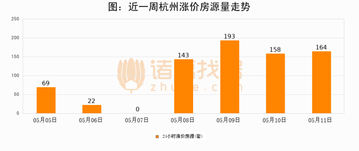 根据诸葛找房数据显示,杭州24小时涨价房源量为164套,较05月10日增加6套,环比上涨3.8%。与此同时,涨价房源占比小幅扩大,业主信心有所提升。