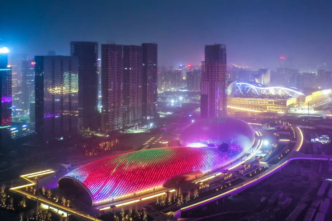 双馆夜景泛光,照明以“银河幻影”为主题。通过波光粼粼、繁星点点、热情似火、闪耀星空等光作品的展示,酣畅淋漓地渲染夜幕下亚运场馆如银河幻影般静谧如诗、安宁美好的意境。