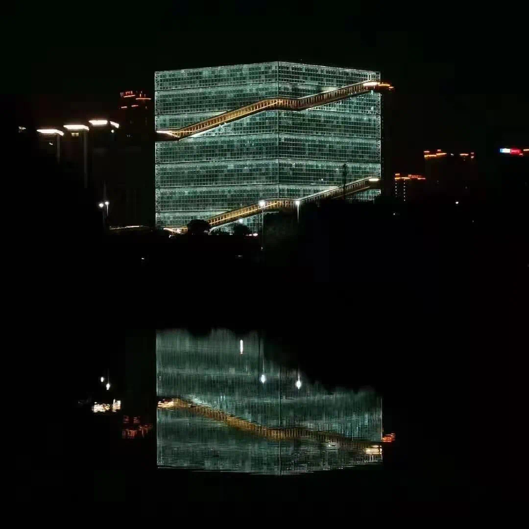 综合训练馆夜景泛光照明以“罅(xià)之光”为主题,通过线条光重点表现玉琮刻痕,建筑步行廊道暖色光与建筑外表皮整体的冷白光形成鲜明对比,烘托“玉琮出土、拔地而起”的向上气概,并彰显运动员向着辉煌前进的体育精神。