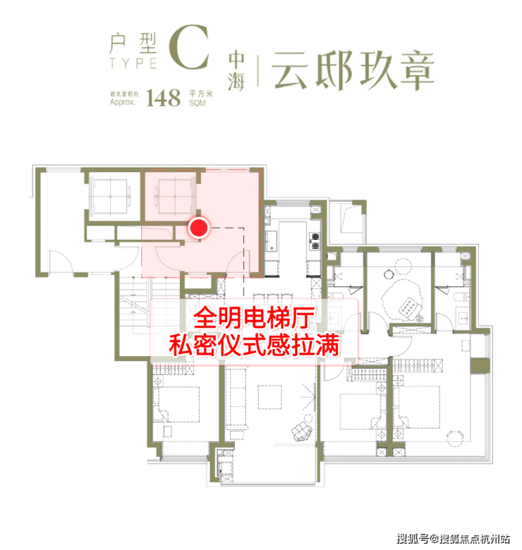 该户型外部呈 类一梯一户设计,将近10㎡的电梯厅空间成为家的延伸,配合门内玄关形成内外双玄关格局,大幅度提升了居家的私密性和仪式感。