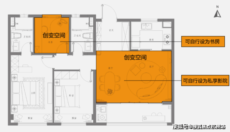 由此带来更具尺度感的公区,彰显主人气度,同时也更具想象空间。业主可以自行设计成家庭影院,北面的房间可以用作卧室,也可以设计为书房,让家随心所欲。