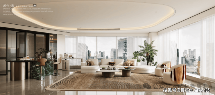 将艺术感进一步融入日常中。特别设计的专属门厅空间,是从电梯厅延伸到家,如同一处艺廊,放慢人的情绪;室内选用了浅金色奢石(外界也称其为“芬迪白大理石”)作为主要的石材,曲面的木饰面也为浅色,整体给人以明亮感。
