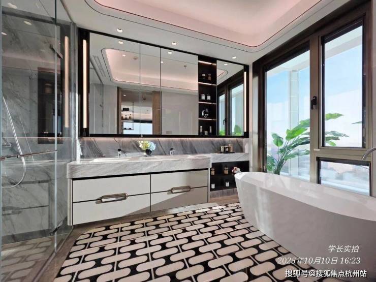 这是125㎡样板间的“女神卫浴”空间,专门利用镜面光、顶光、侧边光墙打造了一个协同光域场,让你站在镜前不会感到传统光源的刺眼,光线均匀柔和洒下,让你在梳妆时每个细节都纤毫毕现。