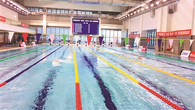 走进中心,馆内的基础设施已初具雏形,不少场馆也已经进入到了工程收尾阶段。就在上个月20日,这座尚未正式对外开放的场馆内,就迎来了自己的排名前列批客人——参加2020杭州市第六届“市长杯”青少年(儿童)游泳锦标赛第四站的近450名小飞鱼们。游泳作为杭州市的优势项目,泳池的建设也不马虎。这里配有一个8道50米标准泳池,以及两个25米的训练池以及6个更衣室、地暖等,占地近10000平方米,能容纳8位运动员同时比赛。而且池水恒温28℃,室温在20℃左右,非常舒适。