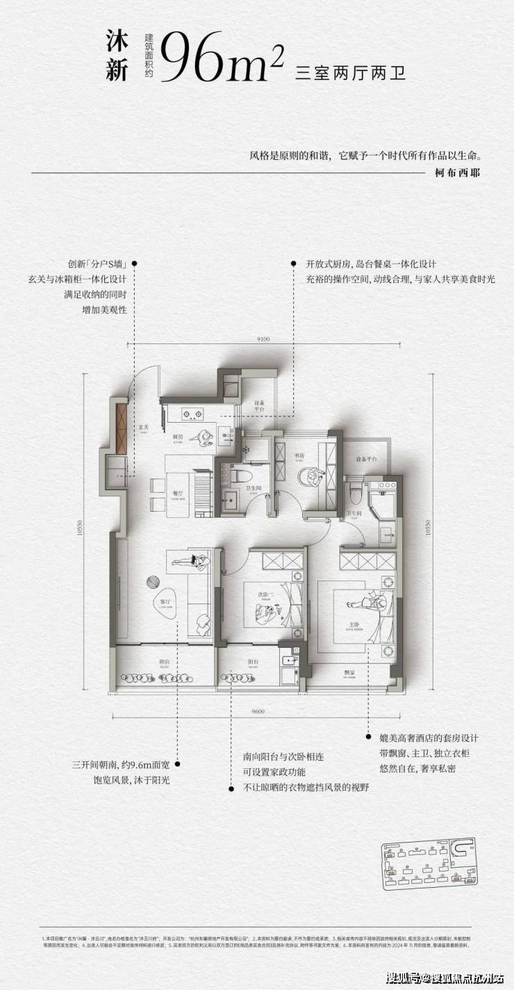 户型设计也花了极大心思:其中三开间朝南的建面约96m²的户型达到了约9.6米的开间,并采用创新“分户S墙”玄关冰箱一体化设计,不但释放了厨房的收纳空间也更符合一般家庭生活需求.创新采用S墙设计,可以做收纳空间,也可以将冰箱外移,实现厨房扩容.