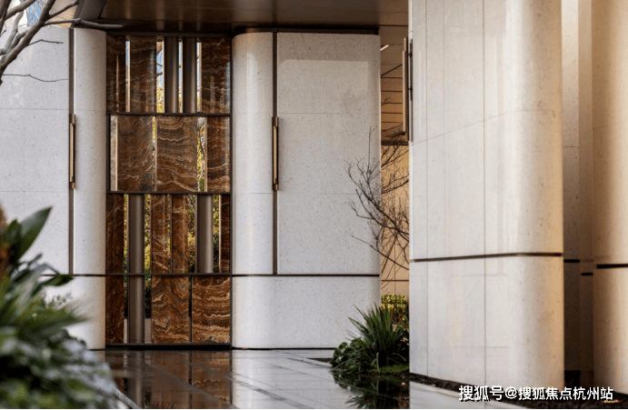 门庭延街的外立面,以精工定制弧形米色石材为主调,镶嵌典藏级老虎玉大理石,点缀古铜色现代海派艺术感灯器,整体呈现出百年海派的贵雅气质。