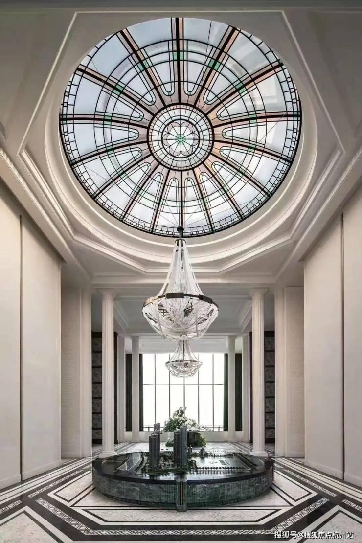 在门庭的环岛空间,景墙面采用中轴对称的设计布局,定制了奢石镶嵌装饰,将曲面艺术与经典石器之美圆融交融。
