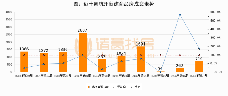 进入2025年第07周(02月10日-02月16日),杭州新建商品房成交716套,较上周增加454套,环比上涨173.3%