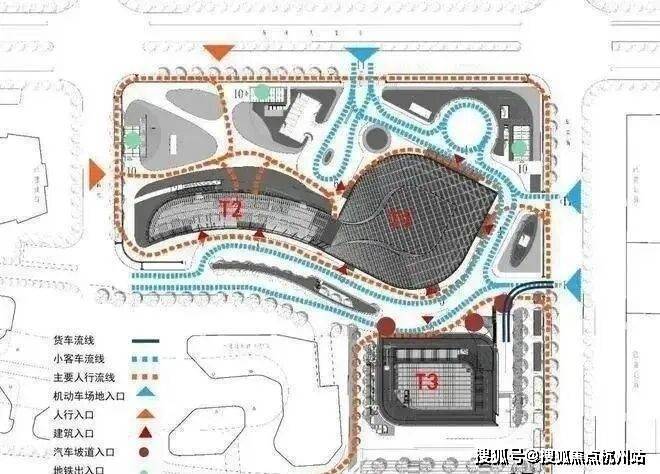 项目总体布局充分体现出对周边环境的友好和尊重。基地北侧沿苏州大道结合三个地铁出入口,尽可能地退让出城市空间,塑造宜人的环境以供市民活动。车行主要出入口结合内部市政道路,集中在基地东西两侧,车库出入口相对集中布置在T3塔楼周围,减少了对主要城市面的影响。