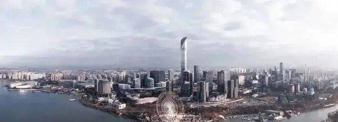 水是苏州历史和城市印象的重要元素,整个苏州城水渠环绕,水道纵横,素有“东方威尼斯”之称。苏州国金中心挖掘苏州“水”元素,迎水展开。 项目设计理念扎根于当地的本土文脉,取“鲤鱼跳龙门”的意向,鲤鱼飞跃之势,寓意繁荣昌盛。整幢塔楼西南面向金鸡湖,从湖面和周边的建筑中拾级而上,T2塔楼似鱼尾,划过一道曼妙的弧线,衔接至T1主塔楼,沿着主塔楼脊背层叠升起,顺应并刻画塔冠弧形造型。T2屋顶与主塔楼西立面及塔冠形成一道上下贯通的内嵌造型,似一道玉带朝向金鸡湖,玉带顶端酒店大堂,如一座空中园林,在此可俯瞰苏州城。所设计出的这一气呵成的建筑型体,将使其打造为城市天际线上一道独特的风景。