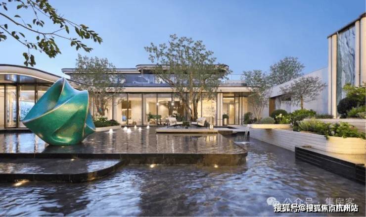 约7米高的主入口,把贝金米黄石材、维多利亚绿等名贵石材,与古铜色金属板、紫薇等名贵草木巧妙搭配、相得益彰,犹如穿着翠绿华服的翩翩公子,透着一身贵气。