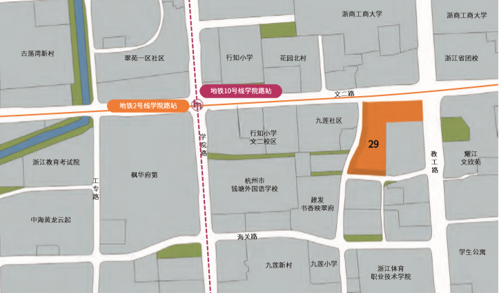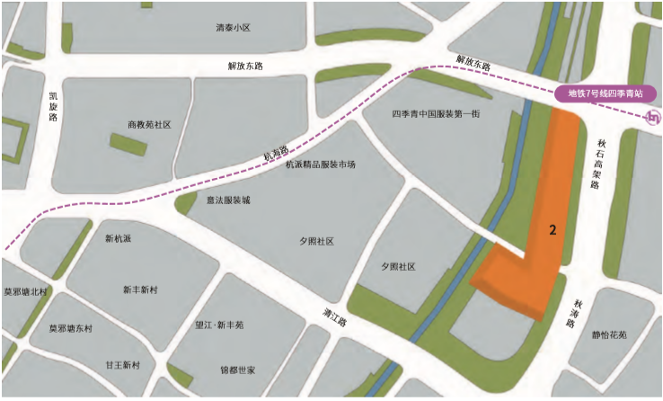 地块位于桥西拱宸桥单元核心,东侧即为京杭大运河,可享一线运河景观。周边业态丰富,有天阳D32时尚街区、小河直街历史文化街区、桥西历史文化街区等文化商业项目,有杭州工艺美术博物馆、中国刀剑博物馆等文化类公建,还有上海外国语小学等教育配套。此外,道路、地铁、水上巴士等多维交通通达。