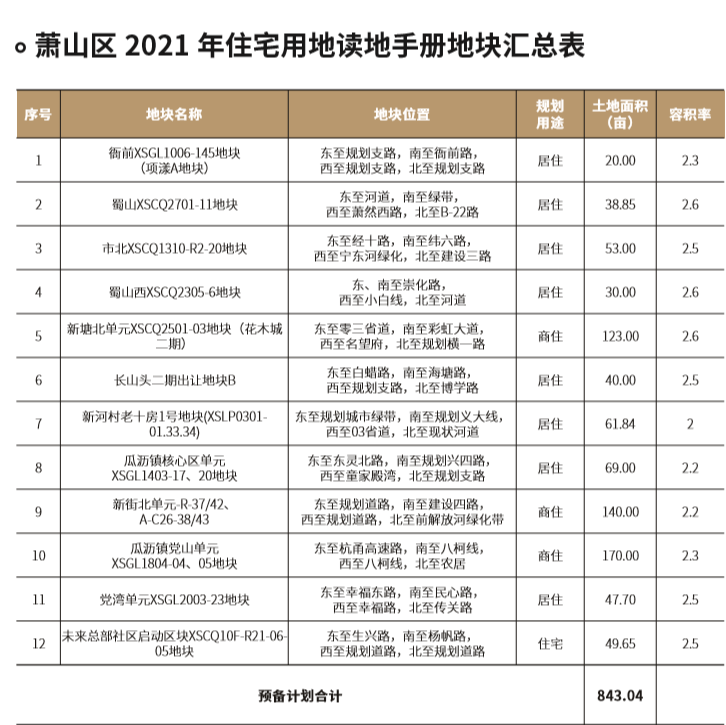 萧山区2021年计划住宅用地36宗,土地面积2034.31亩,另外,预备计划12宗,土地面积843亩。