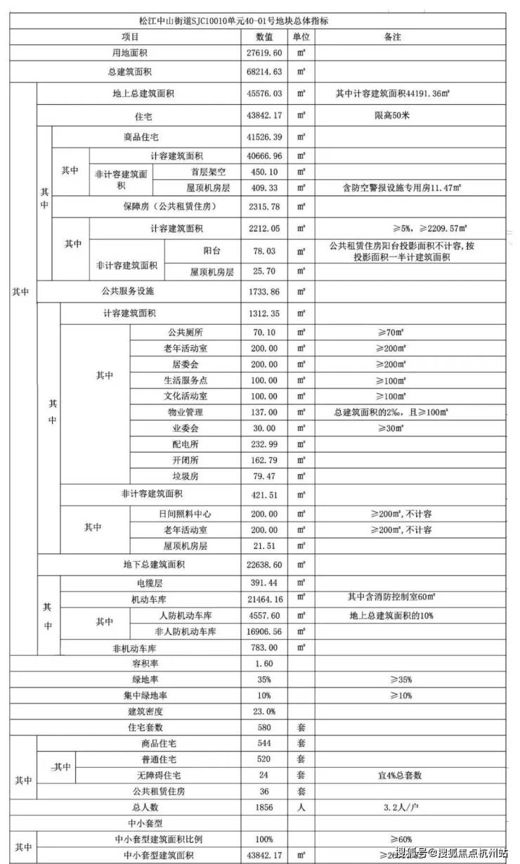 基本参数:项目占地面积约 27619.6㎡,总建筑面积约 68214.63㎡,容积率为 1.6,绿地率 35%,规划有 6 幢 7-16F 住宅,共计 580 户,其中商品住宅 544 套,地下停车位有 598 个