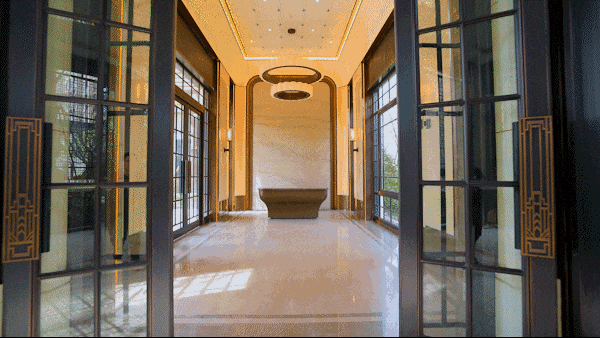 踏入挑高大堂, 巴西银河白奢石与土耳其米黄系大理石的组合,构建色彩递进与质感对比的视觉层次,通过弱化棱角与流动线条,将传统直角的冷硬感转化为温润的包容性。从视觉到触觉的全感官体验设计,将空间转化为承载记忆与身份认同的载体。
