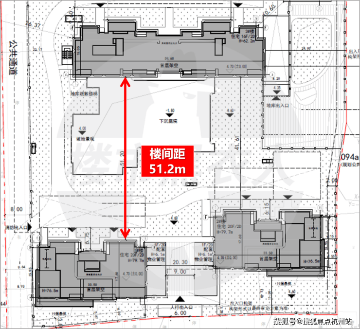 从规划图来看,社区内部广泛运用水景:共有2处大型集中水景+1处宅间水景,周边还有下沉庭院+坡地景观,大概率此处未来社区会所的位置。值得一提的是,项目的楼间距全部在35米以上,最大楼间距达到了约51.2米。