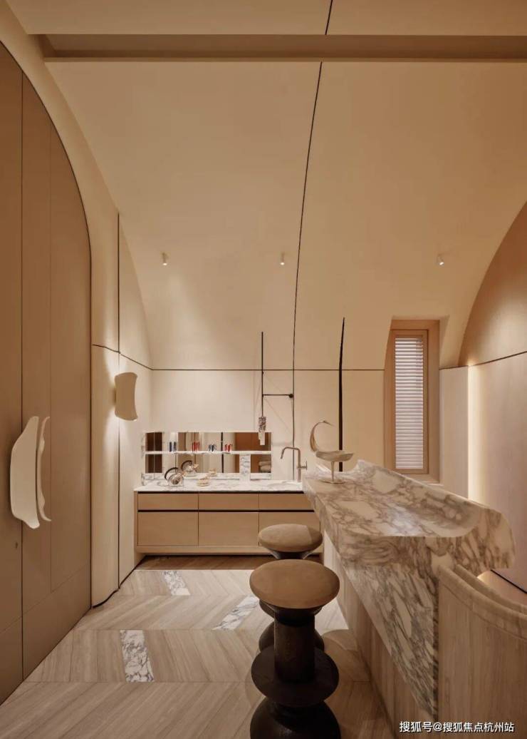 整体以米白色调为主,加入了少许鲜亮橘色,烘托休憩情绪。主卫浴采用双台盆设计,方便双人同时使用,由天然洞石打造的卫浴空间更具有一种低奢隐逸的度假气息。