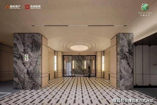 在星级酒店式的单元大堂,铝板飞檐如裁云作玉璜。大门两侧的碎切维多利亚绿奢石纹理独特,如翡翠冻层叠湖底;搭配透光云石背景墙,又似春湖冰层初破时漫溢的潋滟,将“水琢玉成”的哲思凝为具象艺术。