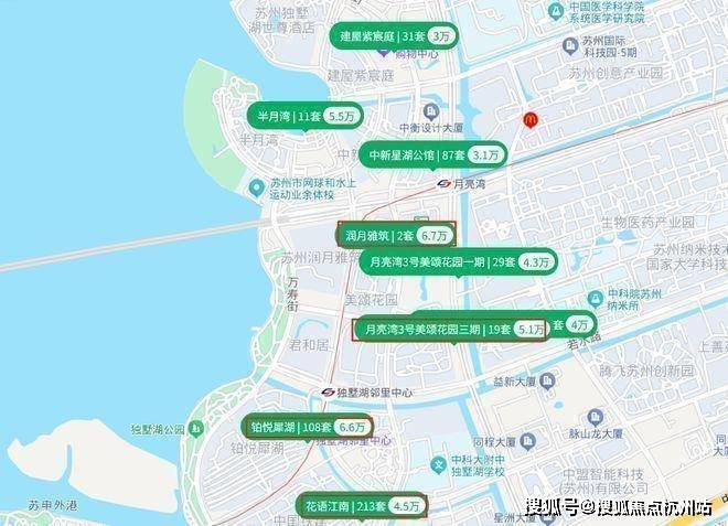 生态方面:项目距离月亮湾畔仅约500米,独墅湖18公里湖岸线、白鹭园、独墅湖生态公园等环绕,形成低密度宜居环境,可享帆船、赛艇、高尔夫等多元健康生活。