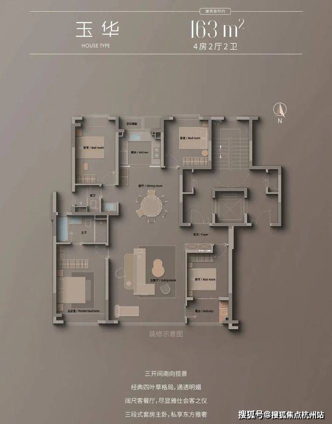 以建面约186㎡四房两厅三卫户型设计,朝南开间14.9米,客厅与卧室双联阳台设计约8米,采光优越,三卧朝南设计,南向双套房设计,南次卧外接封闭阳台。