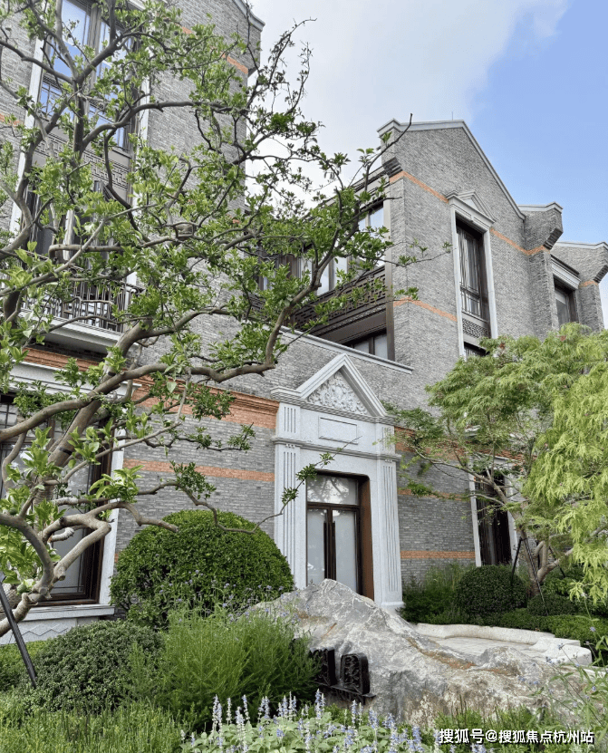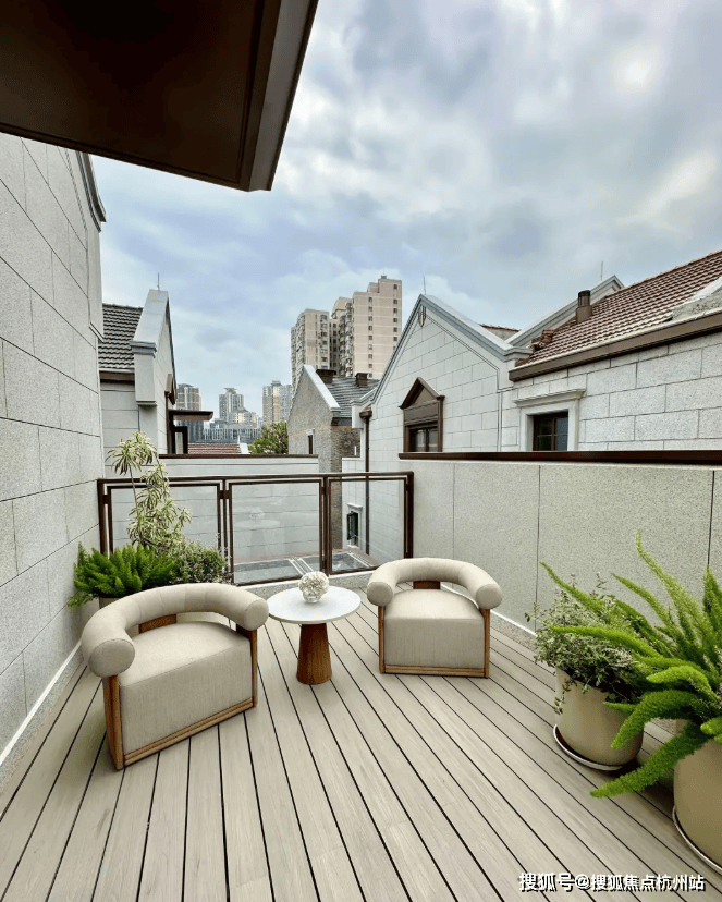 从庭园看向别墅,保留的老山墙、砖楣和门头,再加上悬挑阳台和层层露台,这种传统风貌带给人一种重见历史的感慨,又有温馨、宁静的现代舒适感。
