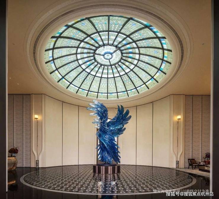 以玉兰门庭—迎归大堂—莳花荟为主轴,敬献步履生辉的归家艺旅:玉兰门庭如繁花盛绽,尊华瑞鳞水景聚运生财,双尊铜狮镇守家宅;迎归大堂流转光影艺韵,百羽栖澜艺术雕塑、芦海宸韵非遗绣作流淌摩登气韵;莳花荟中央会客厅移步异景,献映会客、休闲等雅会。