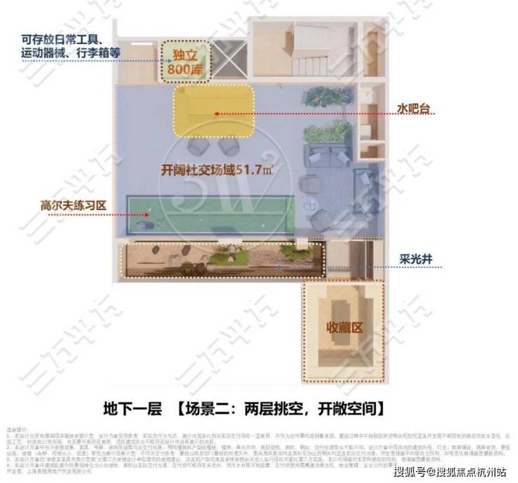 保留东南角的收藏功能和入户处800库,打通中部全域空间,形成约51.7㎡的开阔社交场域,可从容承载十几人的小型聚会。社交区内规划吧台、高尔夫练习区等功能;南侧结合采光井营造庭院景观,为社交场景赋予自然氛围。
