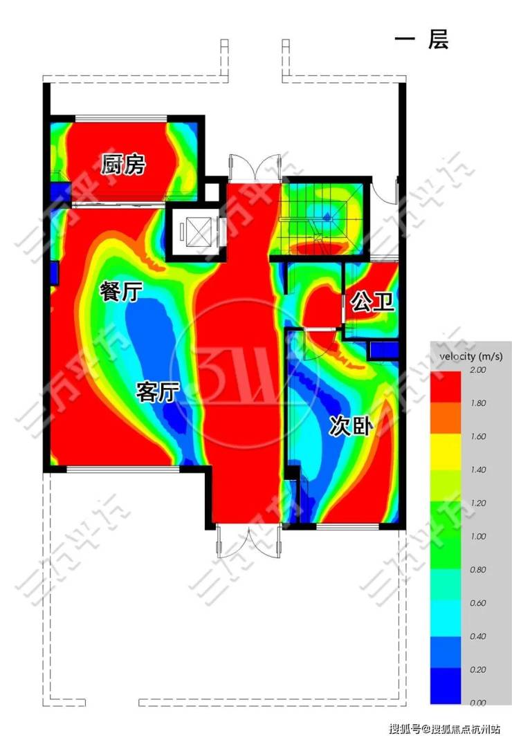 如下图,图上模拟计算的是在春夏季西南风环境下,户内的通风情况。颜色代表风速,红色最优,蓝色基本静止。可以看到,所有房间都拥有最好的通风条件。