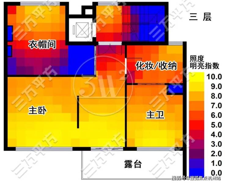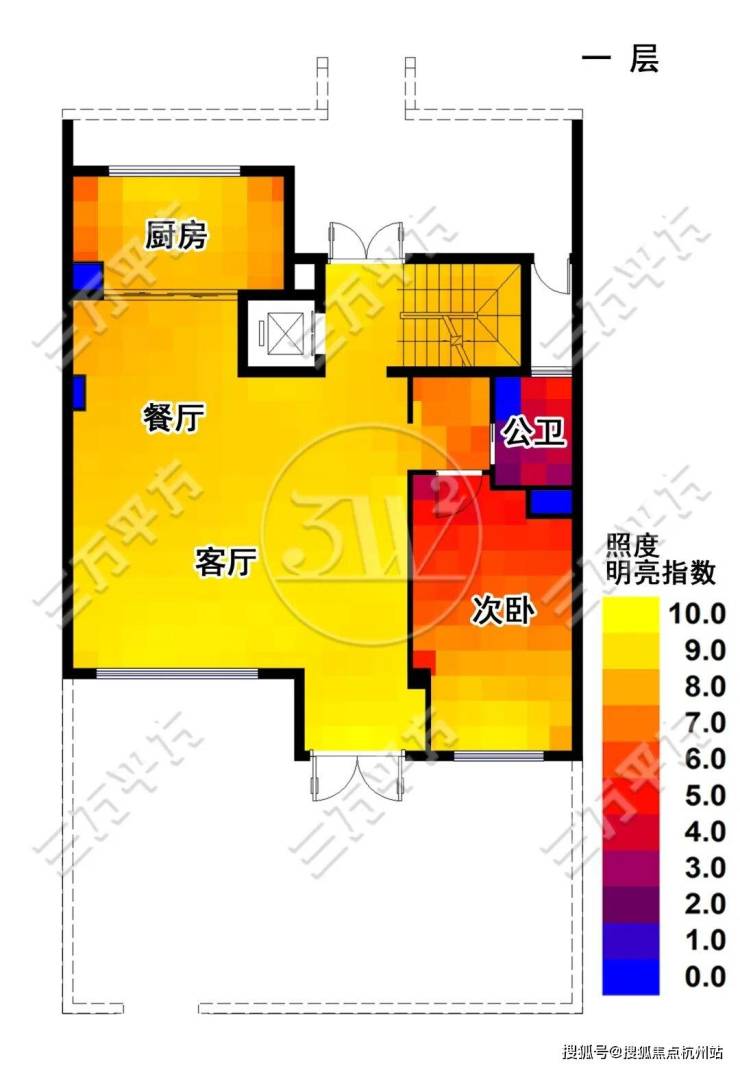 下图为采光测算,照度明亮指数反映了该区域采光条件的好坏。图中黄色代表采光最好的高照度区,从图上可以看出,除楼梯间外,其余房间都拥有很好的采光。