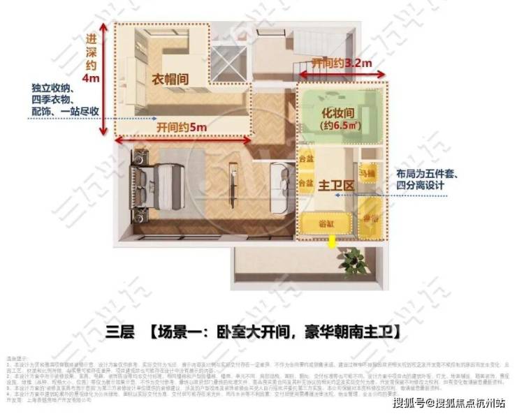 【场景一:卧室大开间,豪华朝南主卫】注重精致度假感的主卧布局方案