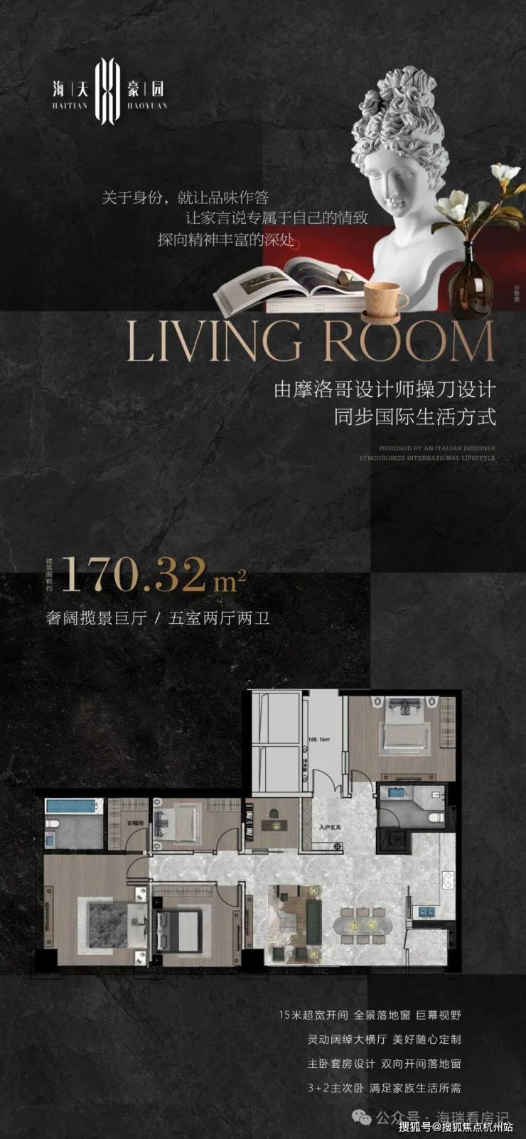 户型设计:15 米超宽开间,客厅及卧室采用全景落地窗设计,通风、采光、瞰景效果好,室内空间开阔,能满足不同人群的个性化需求。