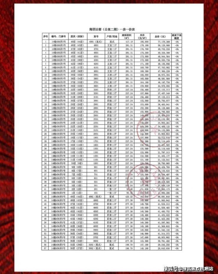 上期一房一价表如下: