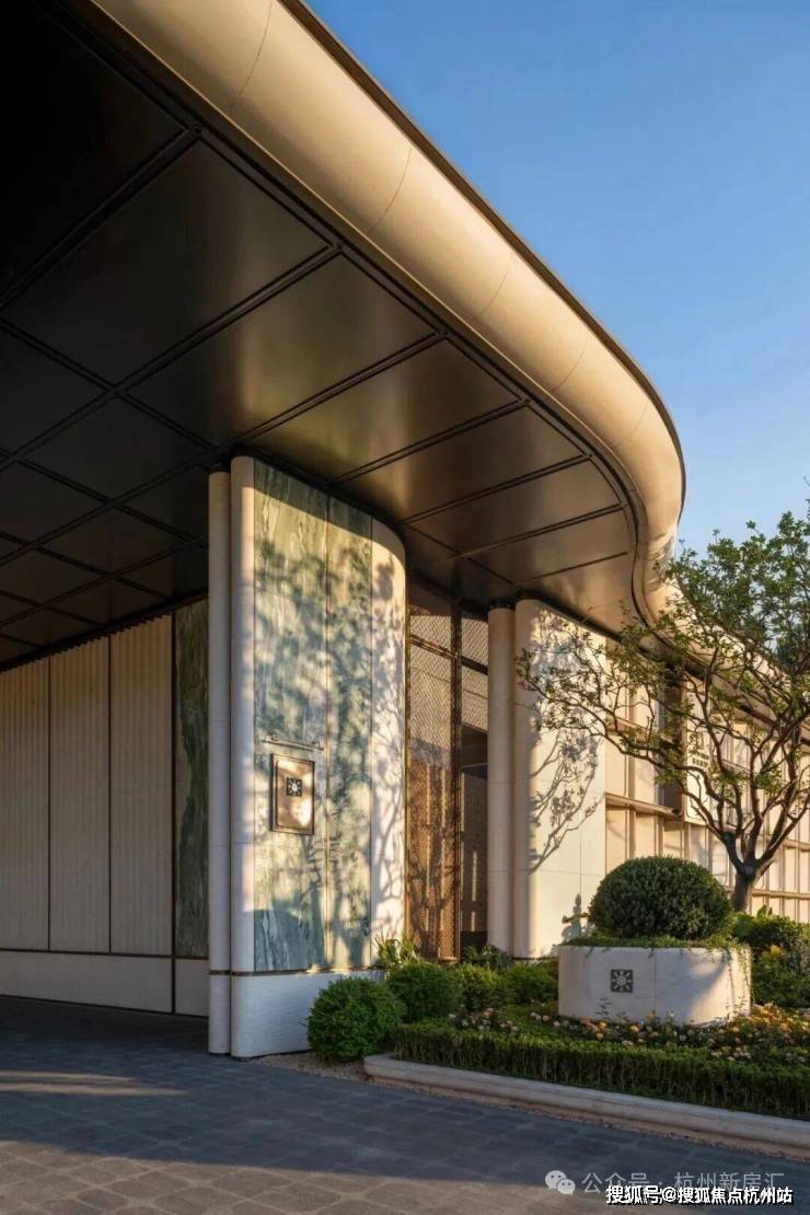 社区主入口是超宽幅门头,宽约80m高约7.1m,两侧的维多利亚绿奢石以及中央的白雪公主透光石很吸睛,浅色的部分则是贝金米黄石材,圆弧的工艺处理也更显温润及价值感,中央栽植的超大紫薇树拥有约60年树龄,底部则是采用宝格丽黑奢石作为基座。