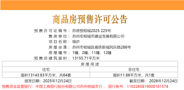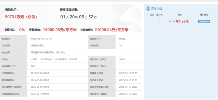 绿城宸庐,即苏地2025-WG-Z04号地块,位于相城区高铁新城民乐路东、陶村街北,是2025年3月12日,苏州宏腾&江苏汇欣鑫以5.53亿的总价竞得, 成交楼面价15828元/平,溢价率5.52%。