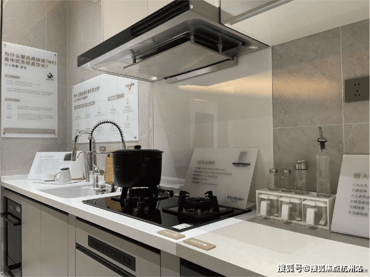 厨房是享受: 人造石大单槽耐热好清洗,台面和水槽无缝拼接,没有卫生死角。抽拉式水龙头清理水池特别方便。油烟机、灶具等用的是富士帝品牌(部分户型配洗碗机、蒸烤一体机)。