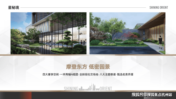 项目整体以摩登东方为核心造景理念,营造一环两轴N组团的景观布局,将花草、树木、流水、山石、景墙编织成序曲语言,在浮躁与喧嚣的城市中,用宁静温润的语言将摩登东方的惬意美好娓娓道来。